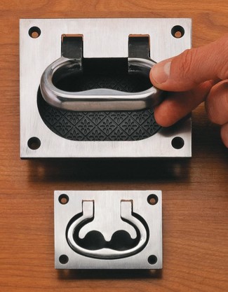 At 2 7/8" wide by 2 1/8" tall, the smaller handle is suitable for boxes, small chests, or access panels as the design encourages using a two-finger grip. Small handle depth is just over 3/8". Requires #6 screws (not included).