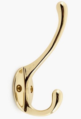 This cast brass vertical double hook projects 2", is 4 1/4" high, and is available with a polished brass, oil-rubbed bronze or antique nickel finish.