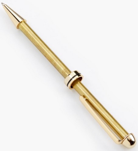 Styled after an elegant design by Montblanc, this medium-weight pen operates with a 3/4-turn. Attractive, nicely balanced, and straightforward to produce, it comes with black ink and takes standard Cross-style refills. The gold finish includes small amounts of cobalt and palladium for abrasion resistance.