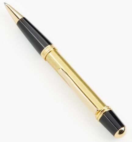 Compact yet comfortable, this pen has a single straight barrel that is easy to turn. The tapered black grip and finial contrast with the plated surfaces, giving it a sleek, refined appearance. It operates with a 1/2-turn mechanism, comes with black ink and takes a Parker-style refill. The gold finish includes small amounts of cobalt and palladium for abrasion resistance.