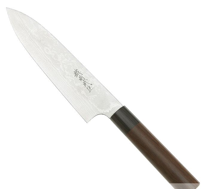 The VG-10 steel core is covered by a total of 16 layers of steel, thus creating an interesting Suminagashi pattern. The round sandalwood handle has an interesting red-brown colour and a black stacked wood ferrule. The blacksmith Shiro Kamo was awarded the title "Master of traditional craft" already at the age of 45 years. The stainless steel blade shows the blacksmith's signature. Hardness 61 HRC, double-bevelled blade.